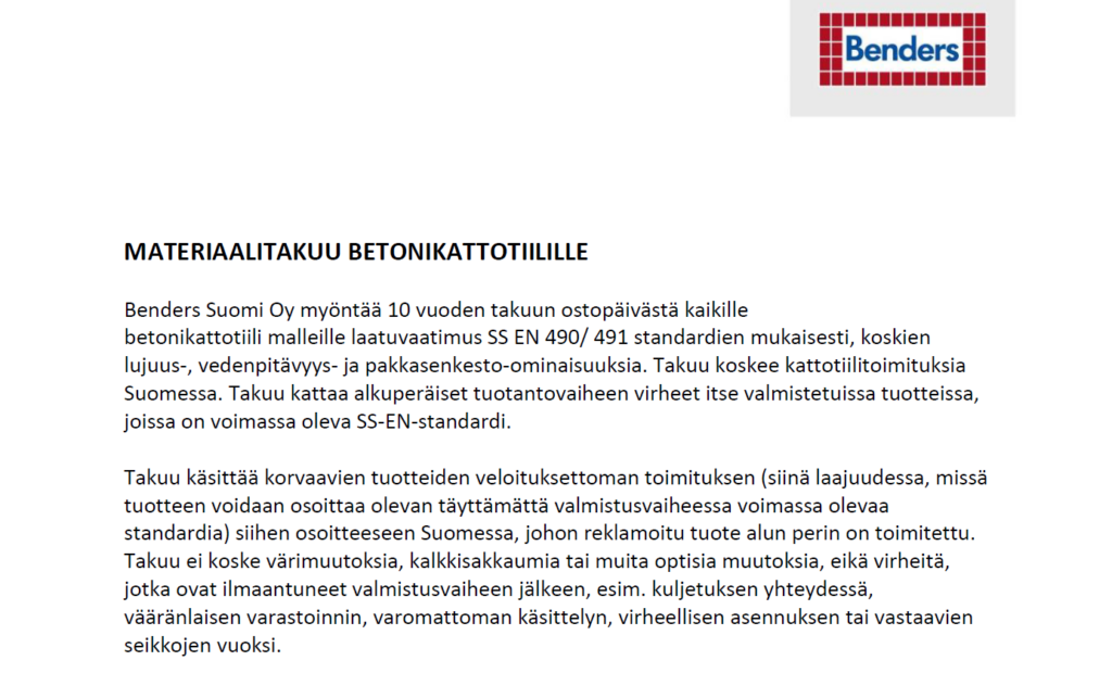 Benders Suomi Oy myöntää 10 vuoden takuun ostopäivästä kaikille betonikattotiili malleille laatuvaatimus SS EN 490/ 491 standardien muk...