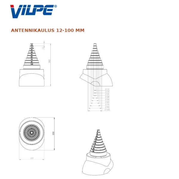 Mitat: Ø 12/19/25/38/50/60/75/90/100 mm putkille. Sisältö: Antennikaulus, kiristin.