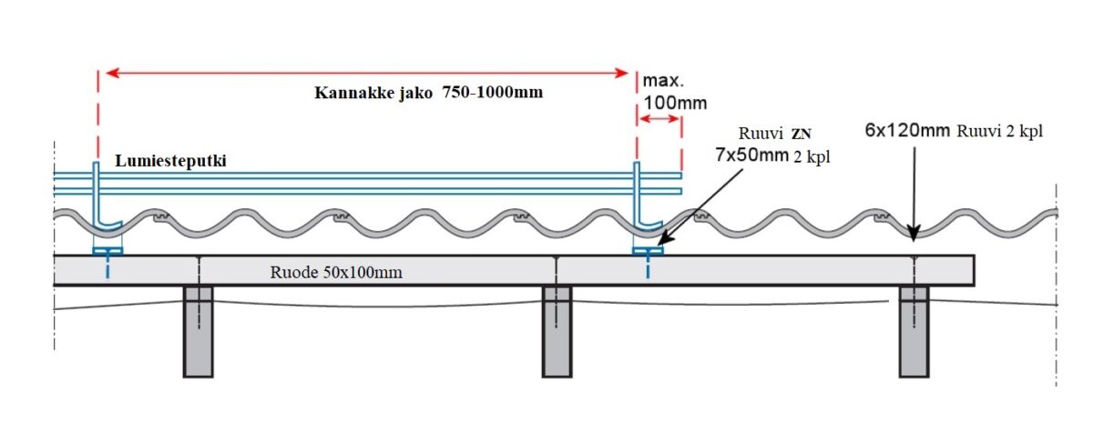Lumiestekannakkeet kiinnitetään apupuuhun kahdella 7×50 mm LVI-ruuvilla, ja kannakkeiden asennusväli tulee olla max. 750 mm yksiputkisella lumiesteellä, ja max. 1000 mm kaksiputkisella lumiesteellä.