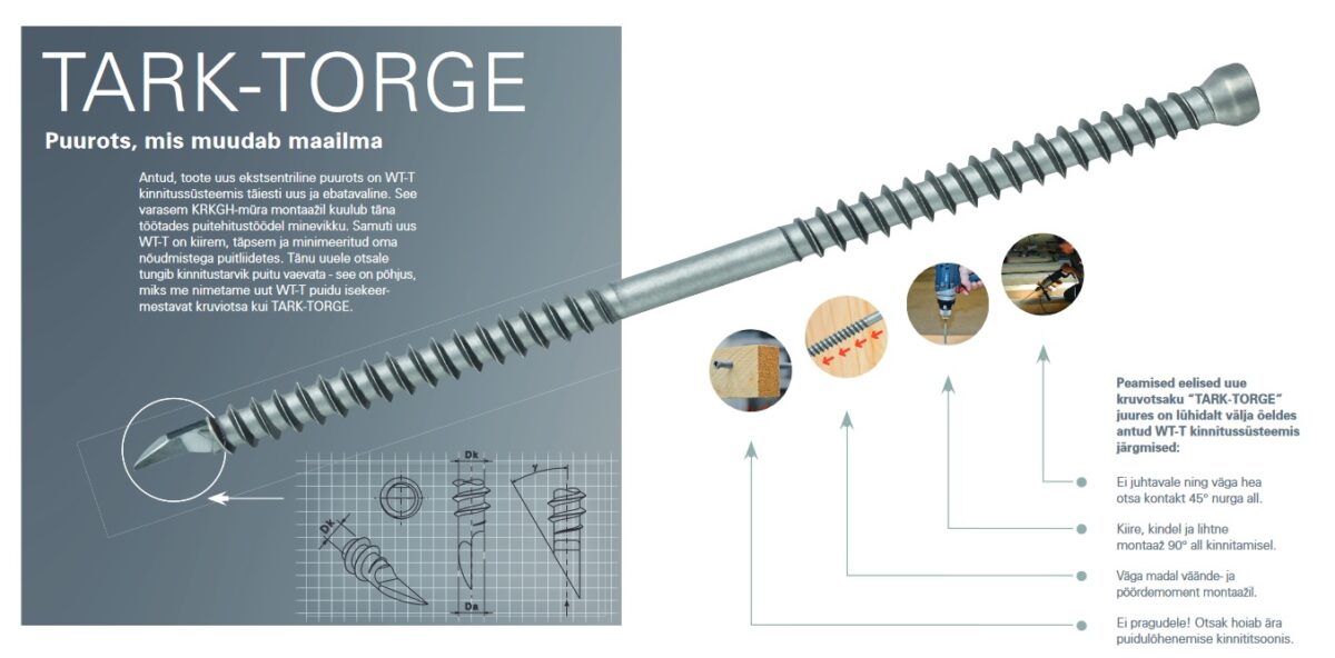 Ruuvi on suunniteltu yhdistämään kaksi vastuullista puurakennetta kahdella kierteellä: ensimmäinen ja takaosa. Takahalkaisija on suurempi, nousu on sama ja kierteen kaltevuuskulma on jyrkempi, mikä mahdollistaa erittäin vahvan liitoksen. Kun kaksi puukappaletta liitetään yhteen, tavallinen ruuvi työntää ensimmäisen irti toisesta eikä voi kiristää sitä myöhemmin. WT-ruuvi varmistaa onnistuneen ja laadukkaan asennuksen ja nopean kiinnityksen. Vakioruuveille, joiden halkaisija on 6 mm tai suurempi, on porattava ohjausreikä puuhun (jotta puu ei halkea), mikä on aikaa vievää ylimääräistä työtä. WT-ruuvissa on poranterä kiinnityskohdan sijaan, joten esiporausta ei tarvita. Siellä on myös Mini WT -ruuvi, joka on suunniteltu ulkoasennukseen julkisivulle, terassille tai lattialaudoille. Puuelementeistä taloa rakennettaessa WT-ruuveilla rakennuskulmat voidaan jättää sivuun, koska osien liitokset pysyvät riittävän vahvoina.