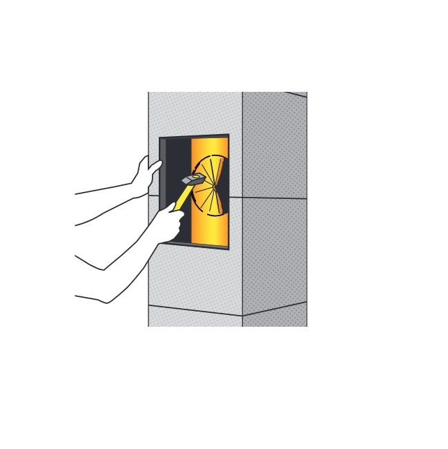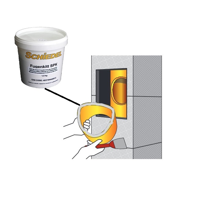 Kostuta sienen avulla jälkiasennuselementin liitosreuna, levitä sen jälkeen koko reunalle keraamista tulenkestävää FugenKit SPK -liimalaastia ja asenna elementti leikattuun aukkoon.