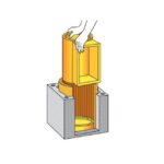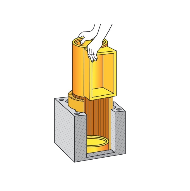 Rondo Plus -moduulisavupiipussa keraamista pohjaa käytettäessä Tulikivi-liitoselementti asennetaan savupiipun ensimmäiseen vaippaharkkoon. Asenna Tulikivi-liitoselementti eristelevyjen väliin siten, että liitoselementin ulospäin ulkoneva liitosviiste jää ylöspäin.