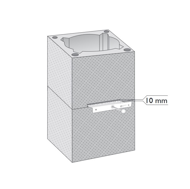 Savupelti on helpointa asentaa kahden keraamisen sisäputken liitoskohtaan, jolloin vältetään tarpeeton leikkaaminen. Merkitse piippuharkkoon pellin aukko putken sijainnin mukaan siten, että aukko on 10 mm pellin yläpintaa korkeampi (keraamisen sisäputken lämpölaajenemisen kompensoimiseksi).