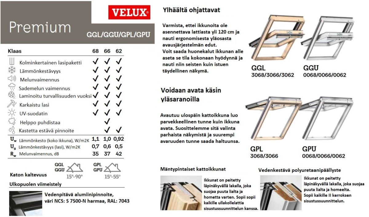 Velux Premium huippuluokan kattoikkunat tarjoavat parannettuja tuote- ja lasiominaisuuksia, kuten paremman äänenvaimennuksen, kastekerroksen tai helposti puhdistettavan peitteen, mikä takaa parhaan lämpömukavuuden ja nykyaikaisen ratkaisun. Ylhäällä avautuvat ikkunamme avautuvat kauniilla muotoilulla ja kätevällä yläkahvalla, joten voit ohjata ikkunaa vaikka huonekalujen alle. Yläsaranoiduissa kattoikkunoissa on tyylikäs kahva alareunassa, jonka ansiosta ne voidaan avata ulospäin. Näin voit nojata ulos ja nauttia häiriöttömästä panoraamanäkymästä ulkona.