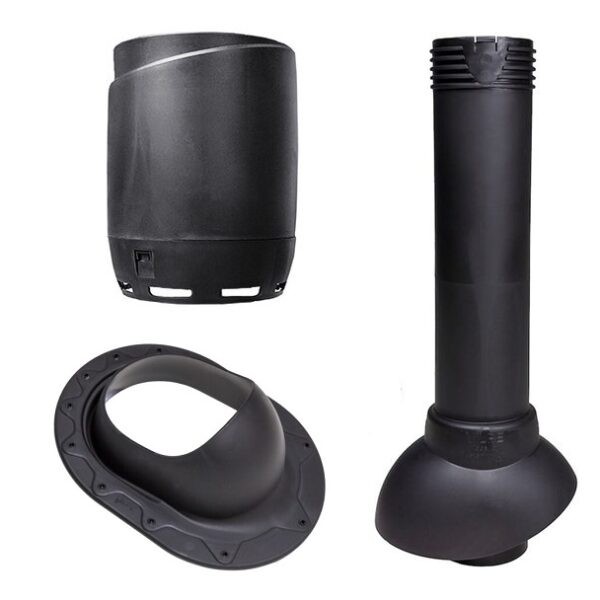 Sisältö: Läpivientitiilen, eristämättömän tuuletusputken, sadehatun, aluskaterengas, ruuvit, sapluuna/asennusohje.